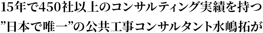 しかし、中小建設会社のための公共工事研究会では、延べ450社以上の建設会社へアドバイスを行い、経営に悩みを抱える中小の建設会社を次々と羽ばたかせてきた主宰の水嶋のノウハウを惜しみなく伝えます。